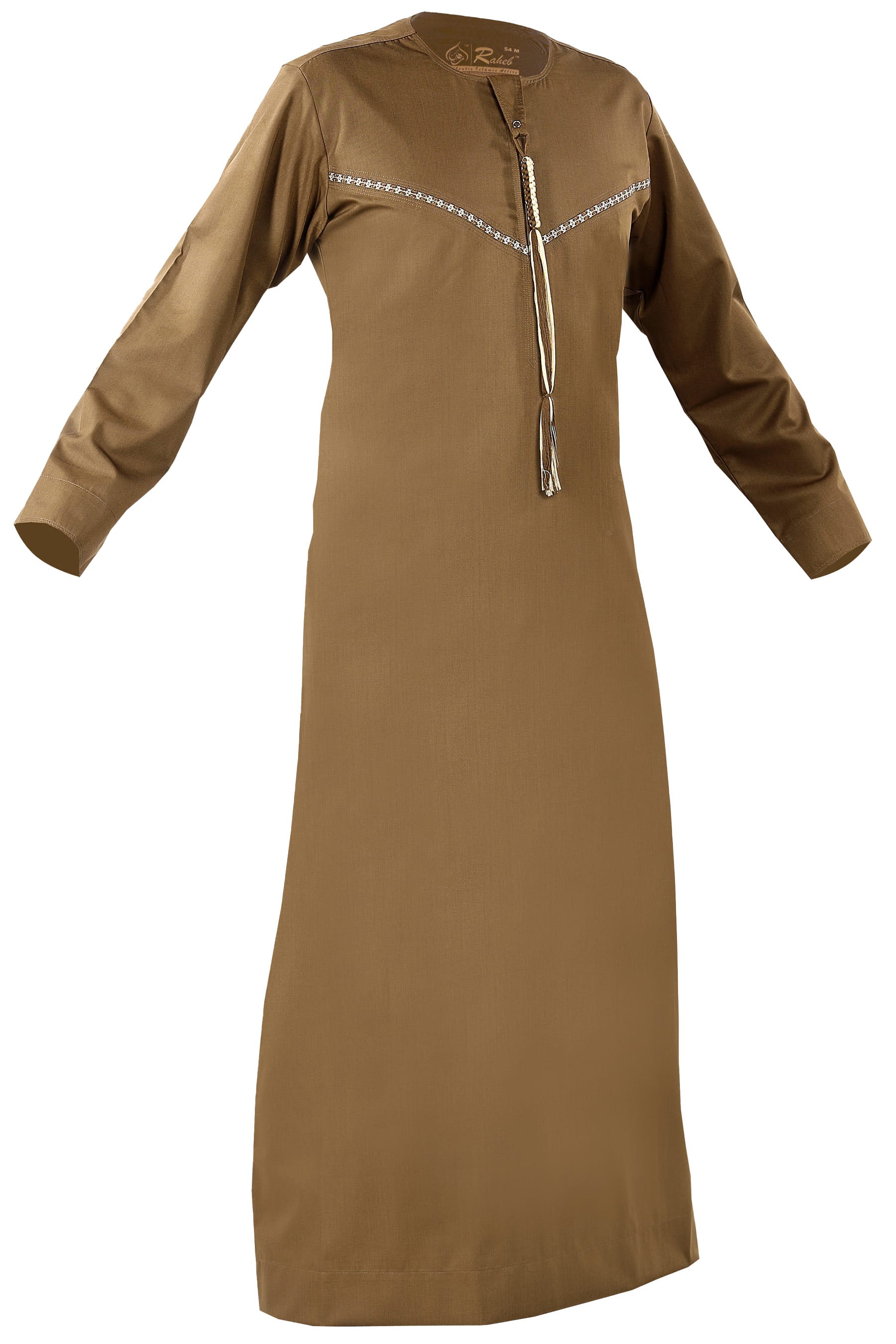 Each thobe features fine Omani craftsmanship, highlighted by intricate tarboosh embroidery around the neckline and chest, and finished with the iconic perfumed “farakha” tassel for an authentic cultural touch.
